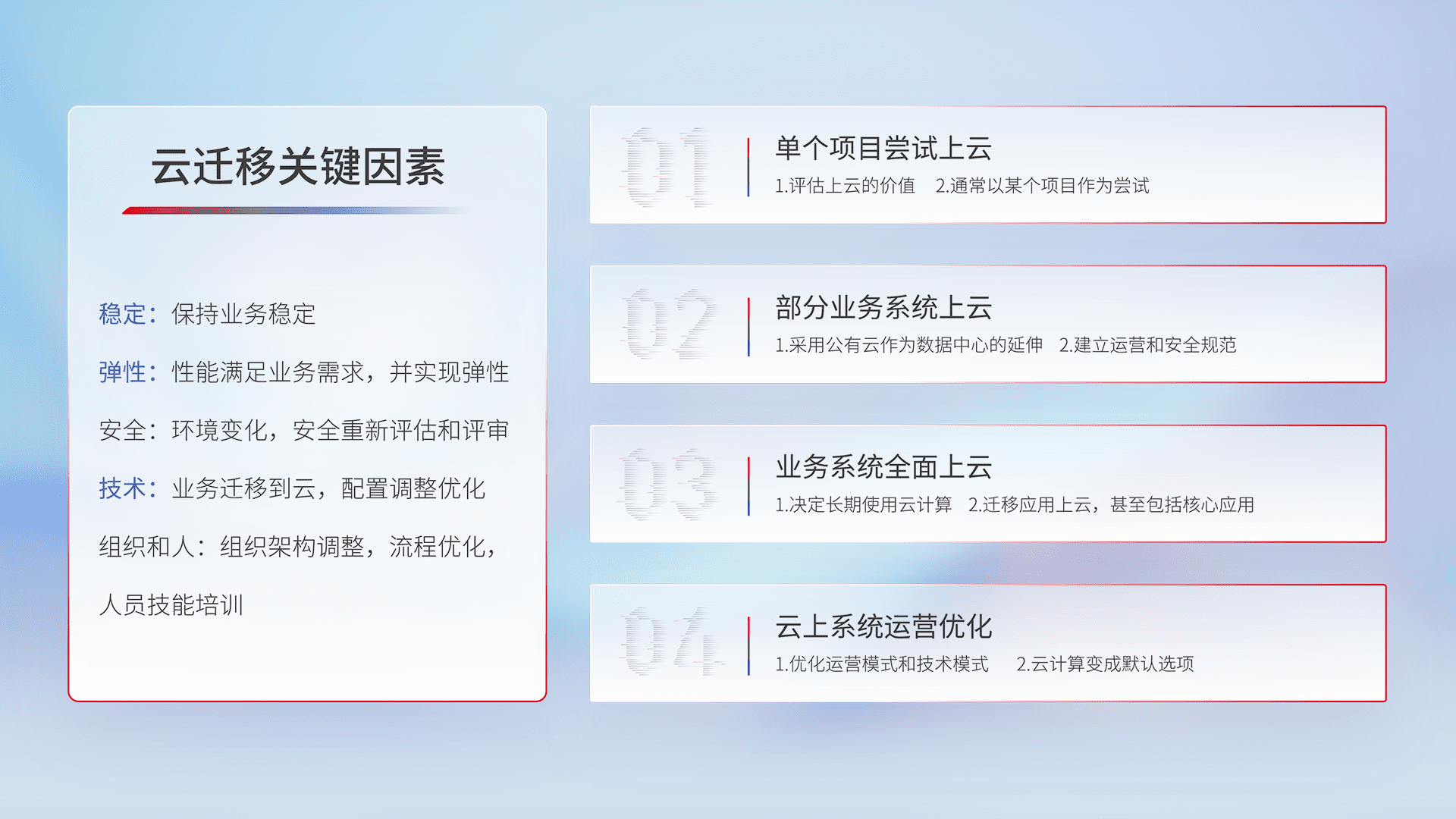 结合实际业务,,从规划设计、、、、云平台选型、、、、云原生改造、、数据迁移、、集成交付,,,迁移全过程为客户识别最佳上云路径,,,做好风险识别管理,,设计网络架构、、、身份权限、、、安全审计合规、、、操作审计、、日志审计、、、、监控告警策略、、多站点容灾设计等,,对云上基础设施进行整体规划,,提升IT治理水平,,,,以满足弹性、、高可用、、高性能的需求。。。。