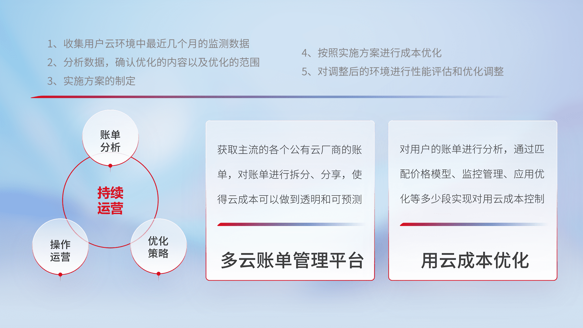 通过多云纳管,,,,以统一的资源数据模型把客户的云资源进行抽象和封装,,,进而实现对多云资源的统一操作,,,保障云资源管理的可靠性、、、、稳定性与可用性。。量身定制化运维内容,,,配置、、、开发运维、、、、补丁管理、、备份、、监控、、、认证和访问管理、、、、审计和日常巡检等,,,保障在用云过程中的可靠度,,,,稳定度以及高可用率。。。